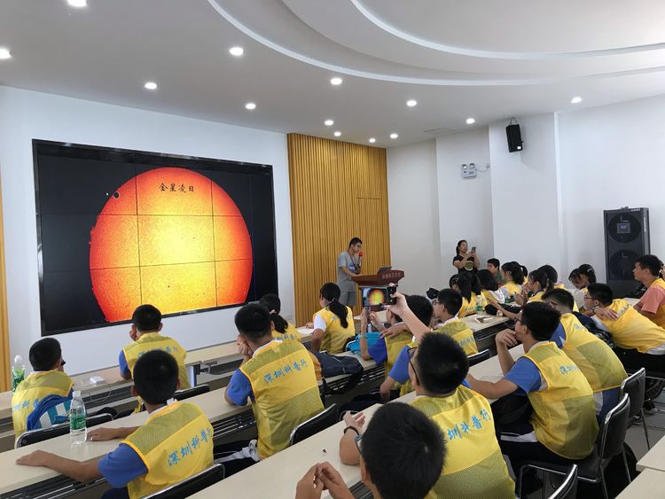 在多功能廳,老師還講解了太陽系的宇宙知識,包括黑子、耀斑、日珥、暗條等,星系里的八大行星,每個行星的簡介等。