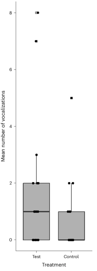 左圖:不同呼叫者對(duì)同一接收者發(fā)出的聲音明顯比不同呼叫者對(duì)不同接收者發(fā)出的聲音更相似;右圖:測試組在接收到回放時(shí)發(fā)出的聲音比對(duì)照組多