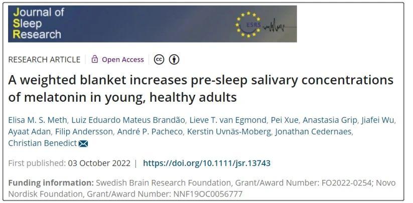 [1].Bodil Ekholm,A weighted blanket increases pre-sleep salivary concentrations of melatonin in young,healthy adults.Journal of Sleep Research.03 October 2022.