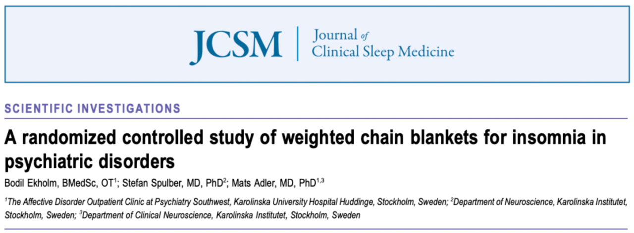 [3].Ekholm B, Spulber S, Adler M. A randomized controlled study of weighted chain blankets for insomnia in psychiatric disorders. J Clin Sleep Med. 2020;16(9):1567–1577.