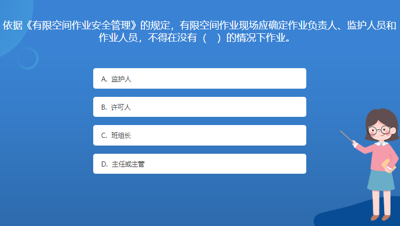 科普基地知識問答:依據《有限空間作業(yè)安全管理》的規(guī)定,有限空間作業(yè)現場應確定作業(yè)負責人、監(jiān)護人員和作業(yè)人員,不得在沒有( )的情況下作業(yè)。